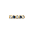 Elevate your elegance with our stunning sapphire diamond ring. Created in 14k yellow gold featuring two dazzling round sapphires totaling approximately 0.20 carats and three brilliant round diamonds weighing a combined 0.30 carats.