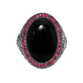 Sterling Silver ring featuring a genuine onyx center stone, surrounded by 37 meticulously hand-set rubies totaling 0.42 carats. The shank is adorned with intricate hand-engraved designs, adding a timeless touch to the piece. Available in finger size 9.5.